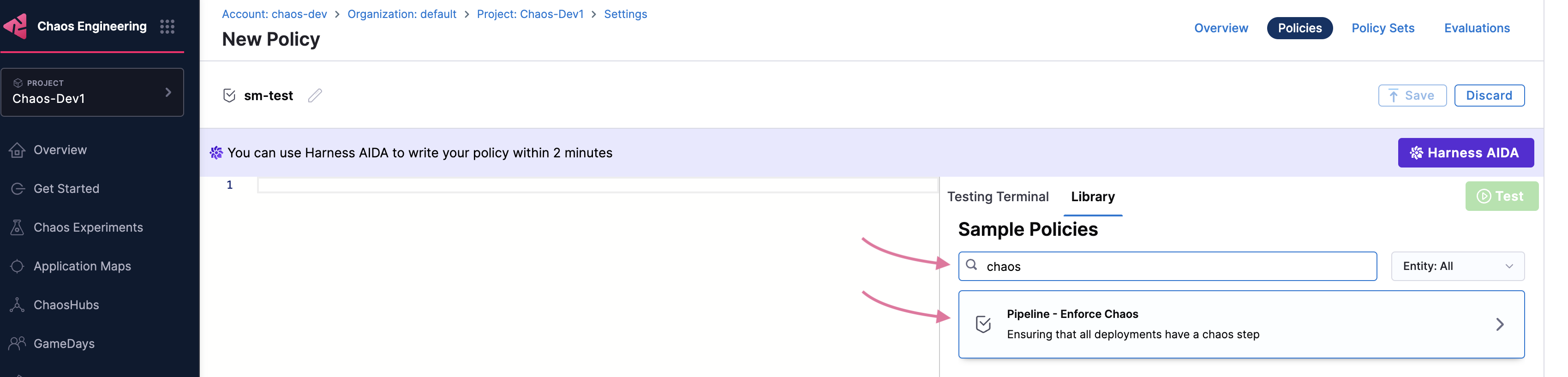To apply an OPA policy to your pipeline, go to Chaos module -> Project Settings. Under Security and Governance, select Policies.